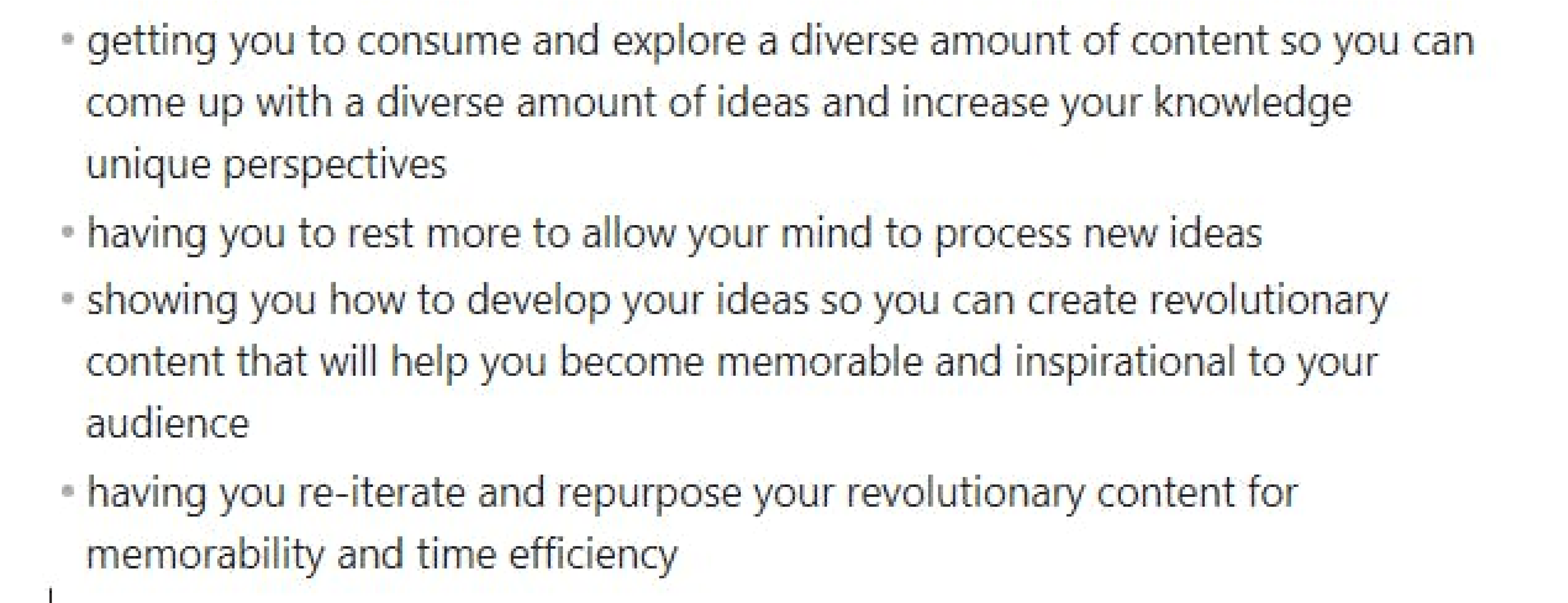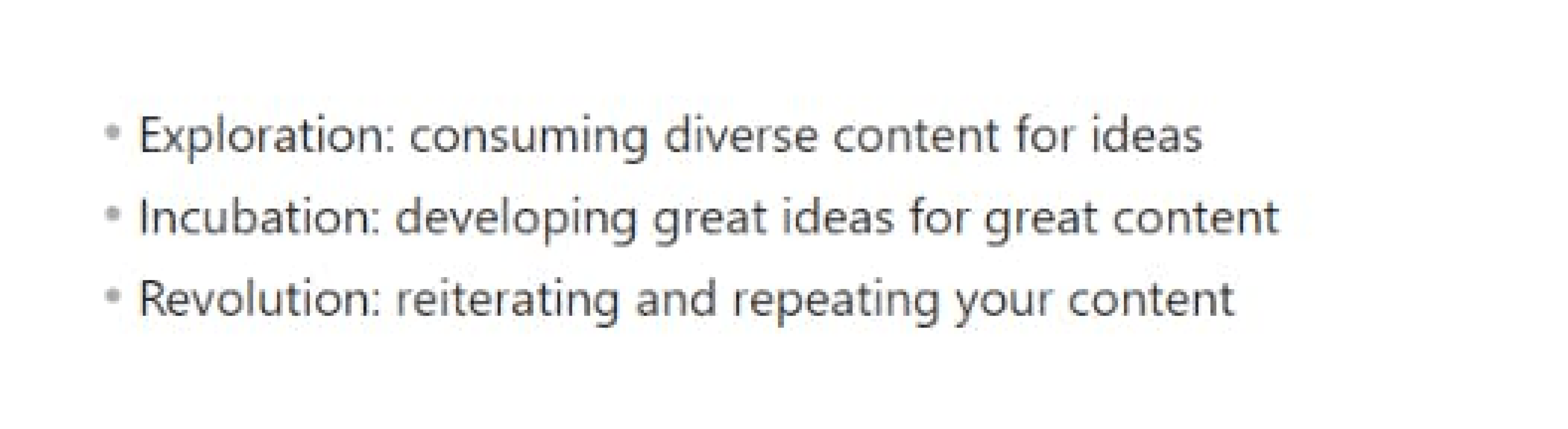Exploration: To consume diverse ideas to generate novel ideas Incubation: To generate and develop ideas, writing impactful content Revolution: Publishing your content, repurposing and repeating your content to revolutionary status Yes yes I’m making gigantic claims using the term “revolution”.