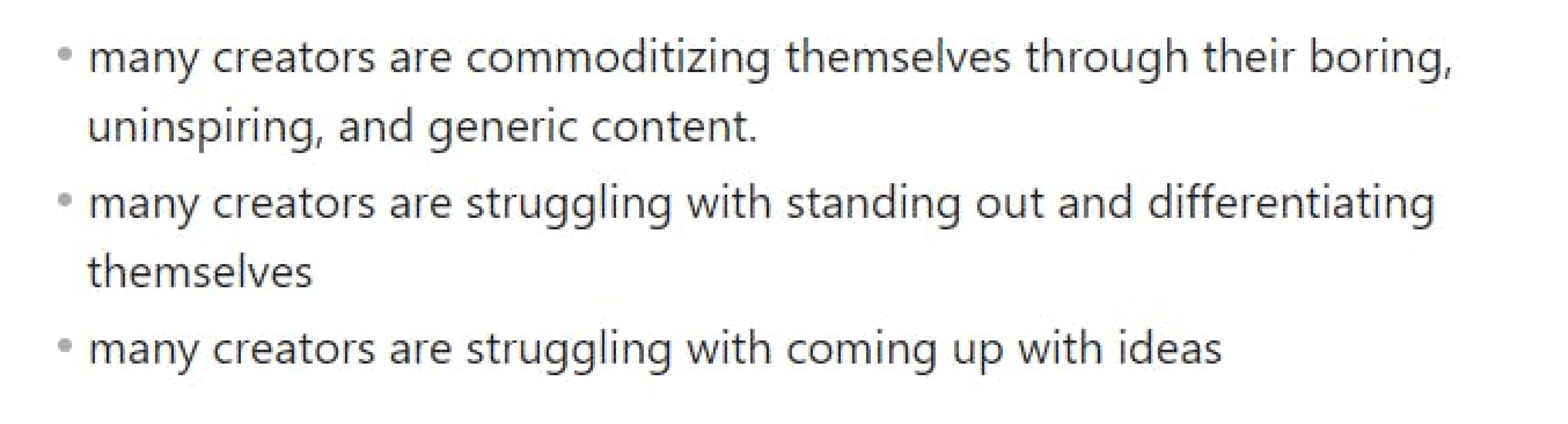 Most do not want to dedicate the amount of effort and have the tenacity to take risks to do this, thus many creators are trapped in this imitation cycle of content. And when you are trapped in it, you become a “commoditized creators.”