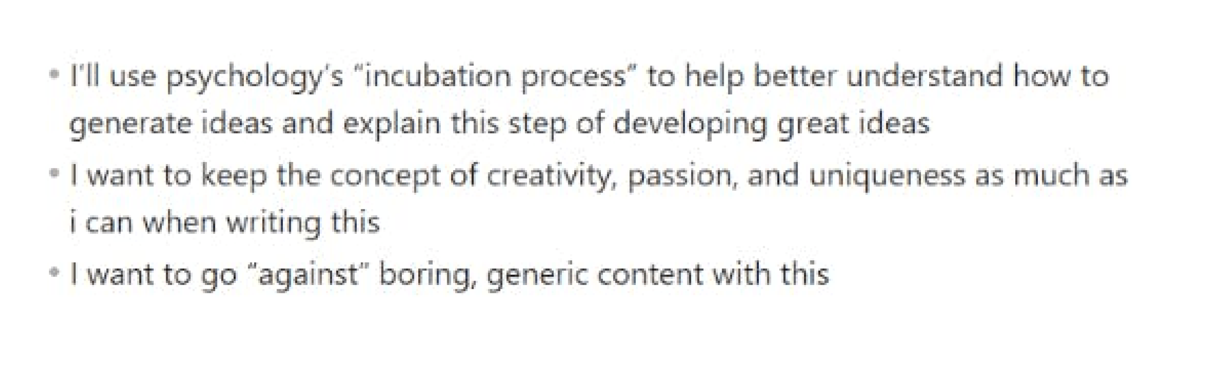 Exploration: To consume diverse ideas to generate novel ideas Incubation: To generate and develop ideas, writing impactful content Revolution: Publishing your content, repurposing and repeating your content to revolutionary status Now let me preface before someone YELLSS at me: if you haven’t wrote at least 2 articles orrr medium to long form content, bro just write and get some volume in to improve. But whether you have or haven’t, if you’re ready to dedicate more time than usual and wanna create b0nkers content, then gyoooooooood.